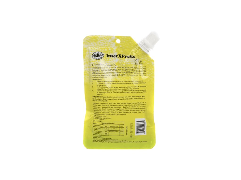Hľadáte ideálne krmivo pre plodožravé gekóny z Novej Kaledónie? ProBugs InsectXFruits ponúka výživovo bohaté krmivo, ktoré si vaši gekóni zamilujú. Receptúra obsahuje minimálne 80% čistého hmyzu, ktorý je doplnené o sušené ovocie a banánové pyré. Táto kombinácia zaisťuje vyváženú, chutnú a ľahko stráviteľnú stravu.