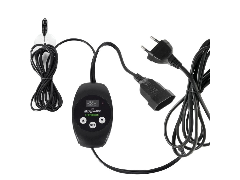 EZ Hygrostat od Repti Zoo je vybavený externím čidlem o délce 1,5 m s přísavkou a alarmem. Přístroj má zásuvku, do které se zapojí zařízení na zvyšování vlhkosti (rosící zařízení, mlhovač apod.), pomocí kterého hydrostat reaguje na změnu vlhkosti.